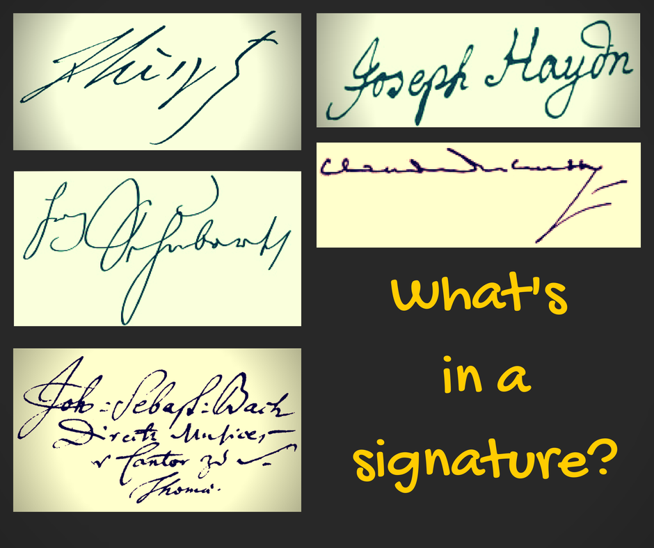 One of my favorite ways to experience the personality a composer is to look at his or her signature. I enjoy that mini picture the composer draws without thinking about it. I don’t intend to pass myself off as a graphologist - the people dealing with hand writing analysis -, but here are some probably crude basics: slanted to the right is the signature of a social person, to the left that of an introvert, and quite straight is the writing style of a logical and practical person. This can be taken further to the open ‘o’-s, and the placement of the dot on the ‘i’, and all sorts of other things.